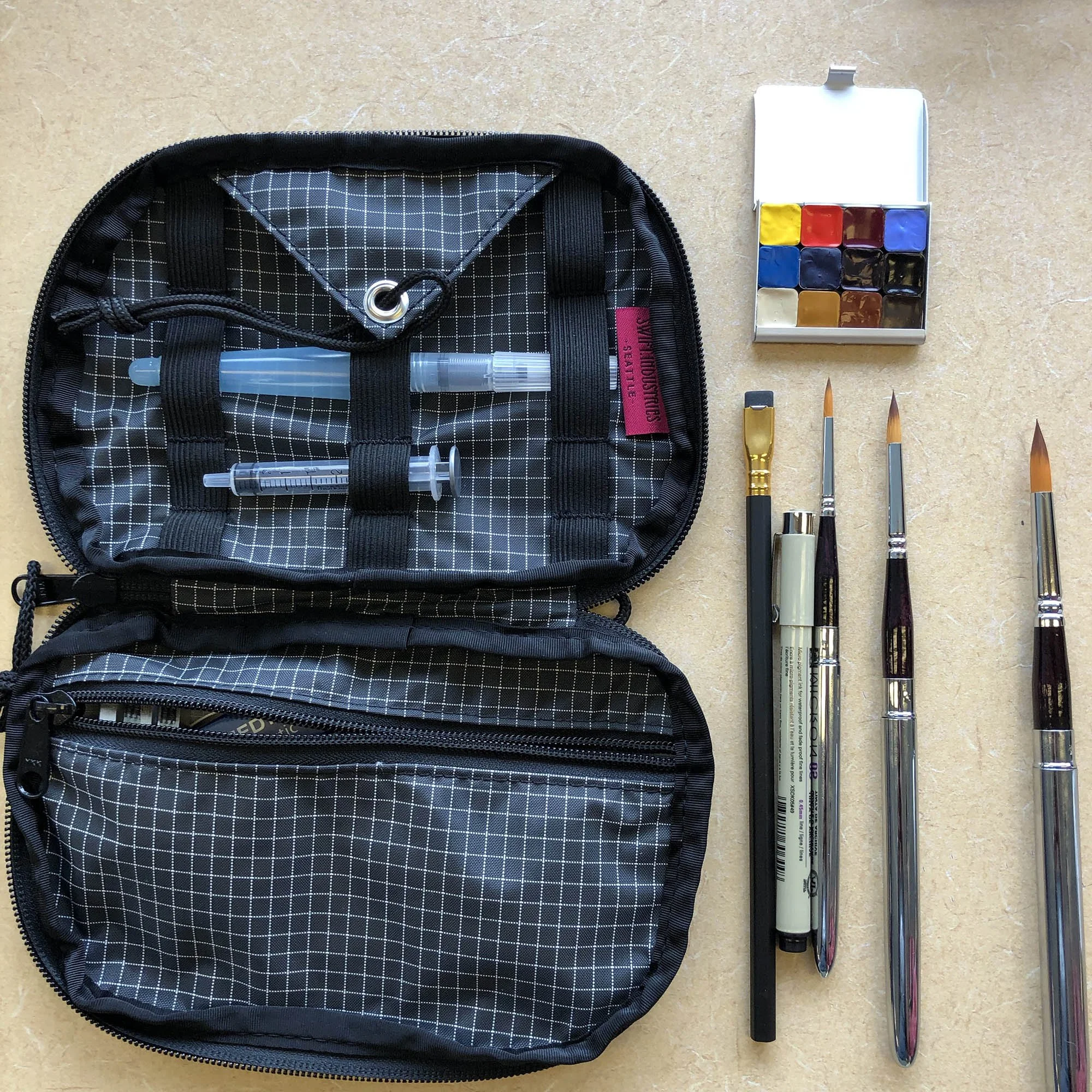 With all these kits, you'll need a good case to carry everything in. The Swift Industries Seeker bag makes a great soft case that has elastic webbing to secure brushes and pens, as well as a zippered compartment for palettes, extras and paper towels.