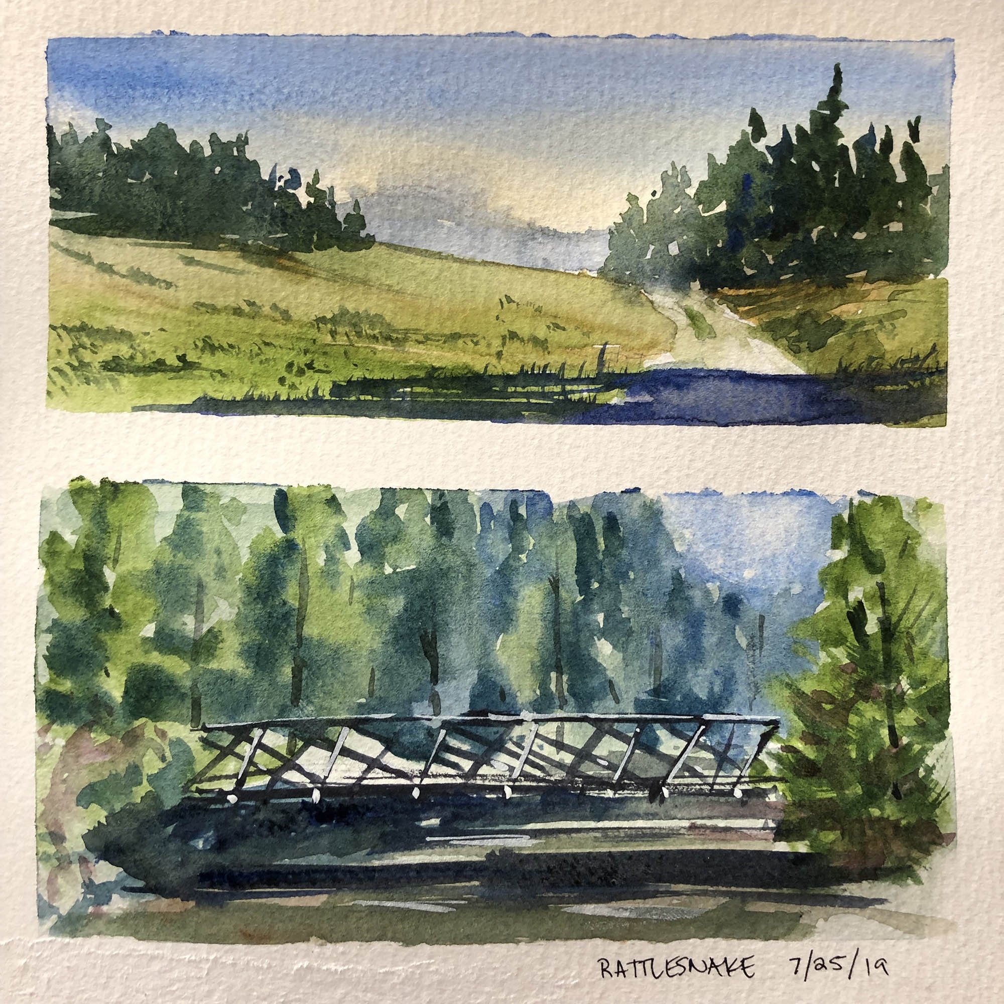 ProTip: PAINT SMALL! When you’re first starting out it is super intimidating to “waste” paper and art supplies. I have found the best way to get over the fear is to use masking tape and turn larger sheets into smaller panels. You learn more by doing a dozen small studies than agonizing over one large finished painting. Take the stress off and paint small!